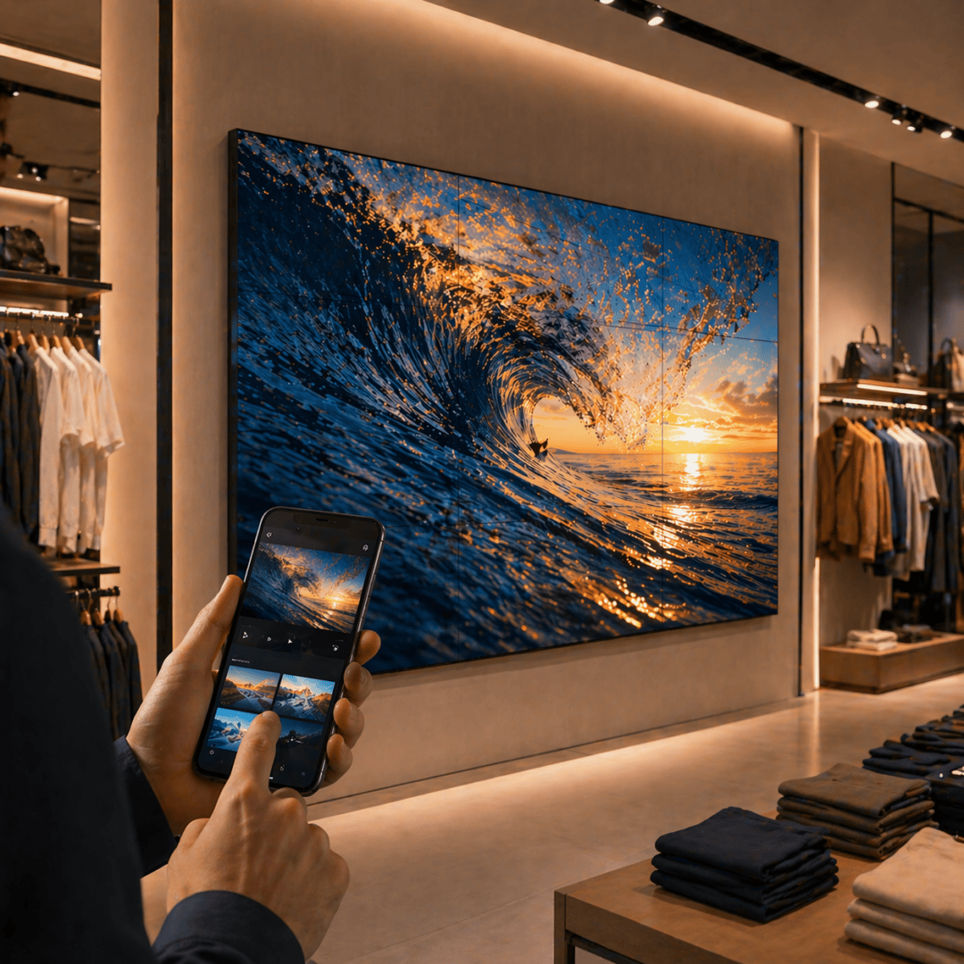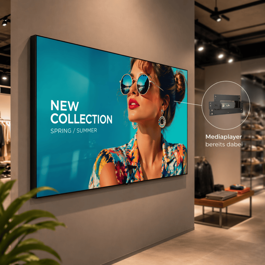 Unsere Hanging Displays, Standing Displays und Wall Displays sind so konzipiert, dass der Einstieg besonders einfach bleibt. Der Mediaplayer ist bereits Teil des Systems und bildet die Basis für die Wiedergabe, sodass keine aufwendige Zusatztechnik nötig ist. Er sorgt dafür, dass Bilder, Videos oder andere Inhalte direkt auf dem Display abgespielt werden können. Vereinfacht gesagt ist das die Komponente, die den Content auf den Bildschirm bringt. So ist für viele Anwendungen die wichtigste Grundlage bereits geschaffen, damit Inhalte schnell, zuverlässig und professionell sichtbar werden.
