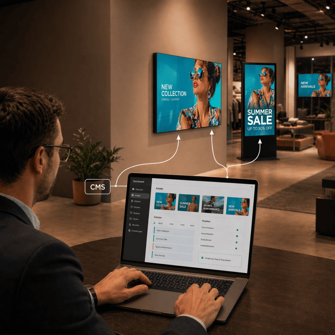 Ein CMS ist ein System, mit dem Inhalte organisiert, gepflegt und gezielt auf Displays ausgespielt werden können. Es eignet sich besonders dann, wenn Inhalte regelmäßig aktualisiert werden oder mehrere Standorte und Bildschirme zentral verwaltet werden sollen.