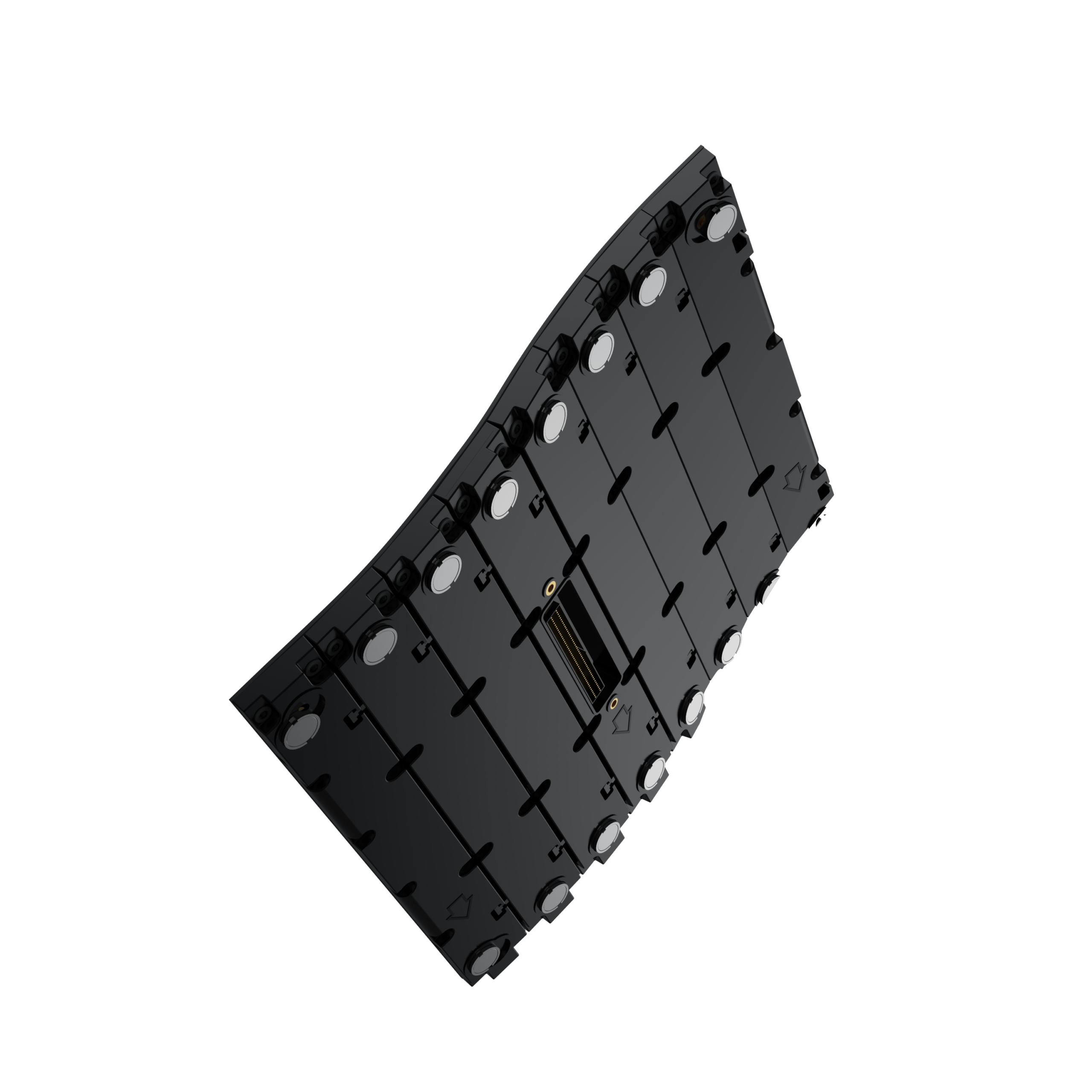 Basis ist das 250 × 250 mm LED-Panel. Es wird in sogenannte Housings eingesetzt, die in mehreren Größen auf diesem Raster basieren und nur knapp fünf Zentimeter tief sind (≈ 47 mm). Das Housing wird an Wand, Decke oder freistehend montiert; anschließend werden die Panels eingesetzt und verriegelt – mit Positionierlocks für schnelle, präzise Ausrichtung. Die interne Verkabelung bleibt unsichtbar, der Aufbau erleichtert schnellen Service. Intelligente Module übernehmen Kalibrierdaten automatisch; optionale Power-/Signal-Redundanz und einstellbare Helligkeit sichern einen homogenen, verlässlichen Betrieb über die gesamte Fläche.