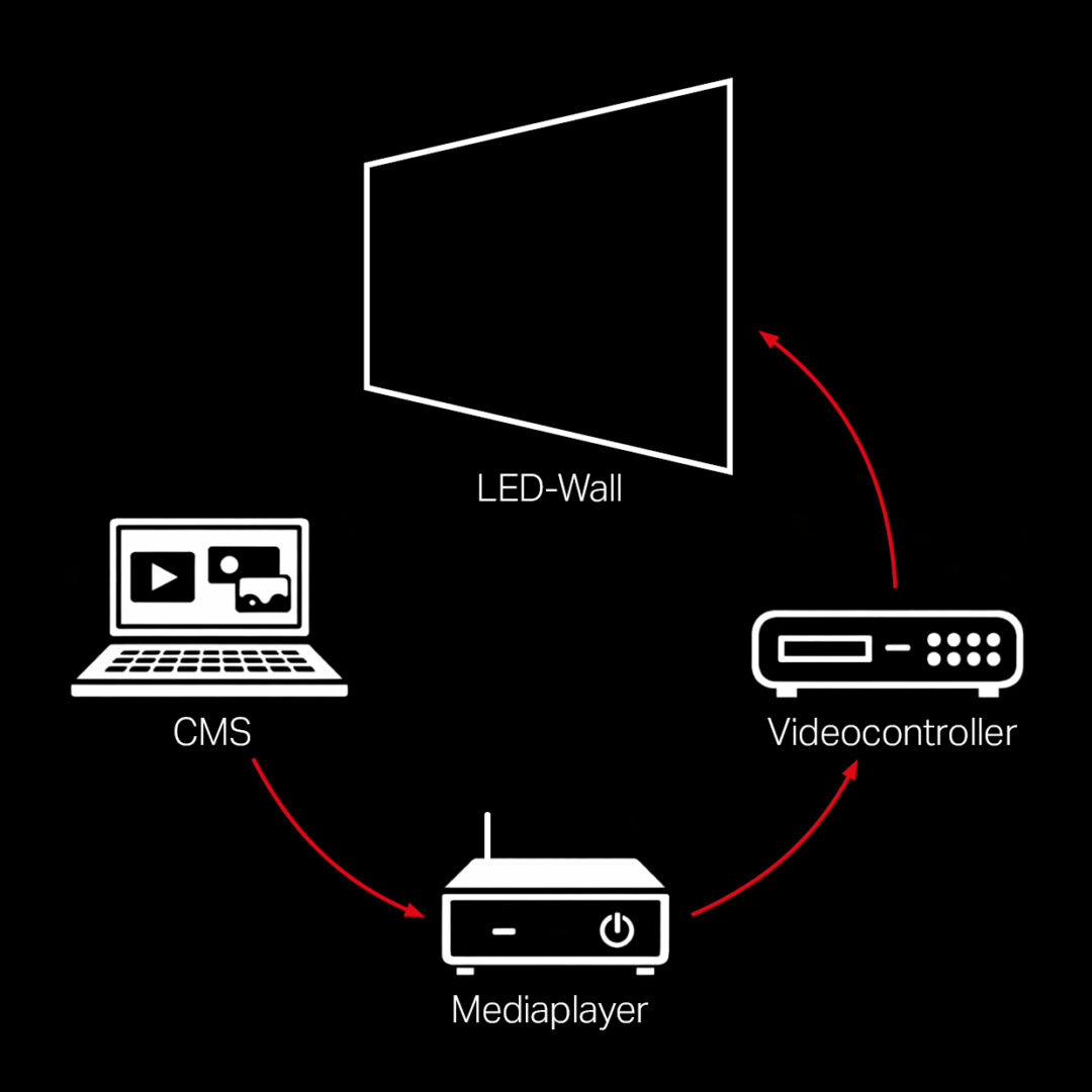 Die LED Wall wird per Kabel an einen Video-Controller (z. B. NovaStar VX600) angeschlossen. Der Controller nimmt gängige Signale entgegen – etwa von einem PC, einem USB-Mediaplayer aus der Cloud (z. B. OptiSigns) oder drahtlos via ClickShare – und verteilt sie synchron auf die Wall. So lassen sich Präsentationen, Kampagnen oder Loops einfach starten und zentral steuern; Auflösungen und Layouts werden vom Controller passend skaliert. Ergebnis: zuverlässige Wiedergabe, klare Bilder, einfache Bedienung – vom Meeting bis zum Dauerbetrieb.