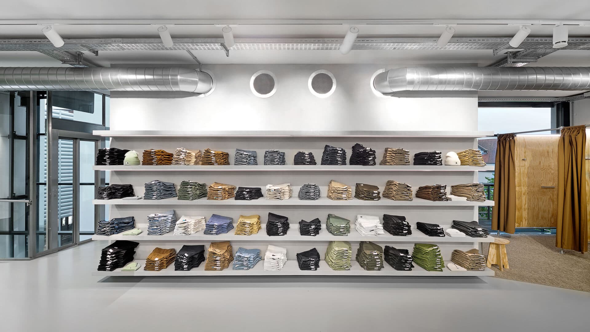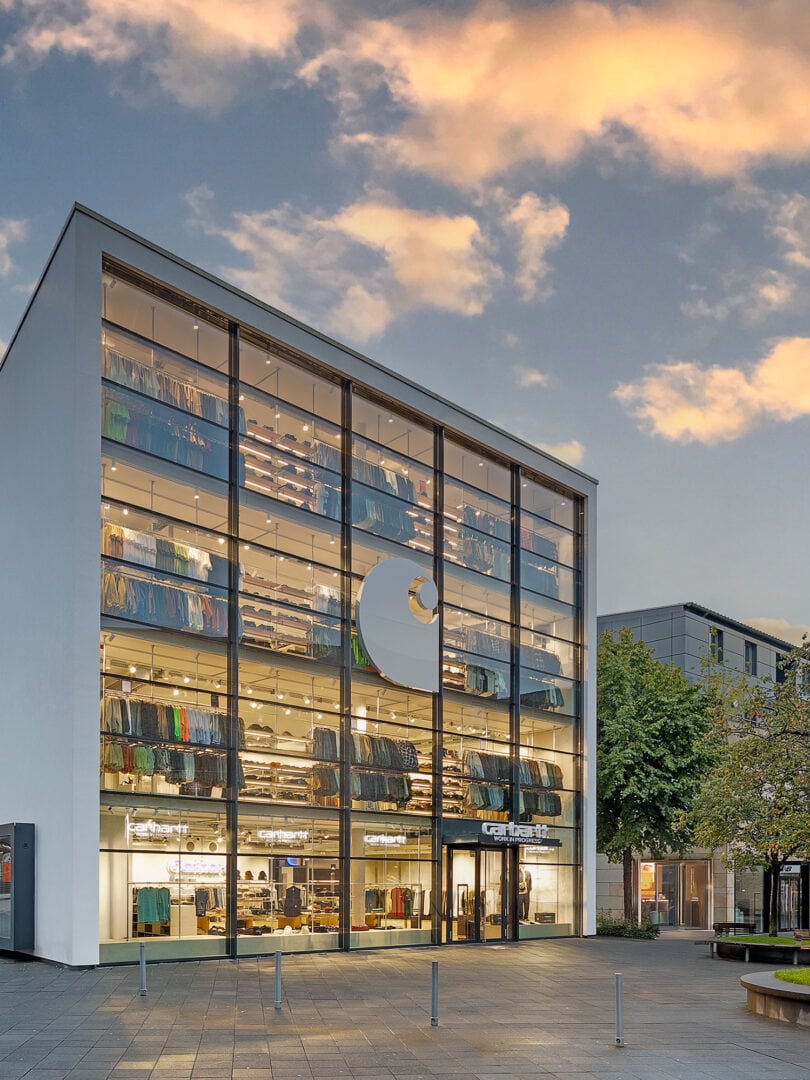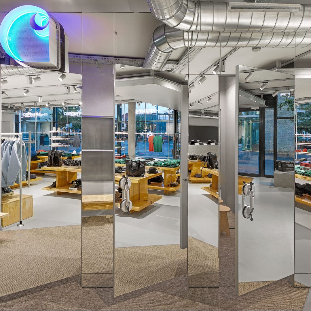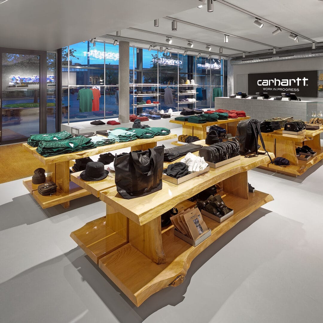 Vier Ebenen, klar strukturiert: authentische Materialien, robuste Details und flexible Module übersetzen die Carhartt-WIP-DNA präzise in die Fläche. Echte Gerüstwände, hochglanzlackierte Zedernholz-Tische mit handgegossenem Epoxidharz und der neu gedachte Kassenblock zeigen das Zusammenspiel von Funktion und Gestaltung. Trotz extrem knappem Zeitplan entstand in acht Wochen ein Store mit industrieller Klarheit, warmen Akzenten und spürbarem Outlet-Flow – terminsicher eröffnet.