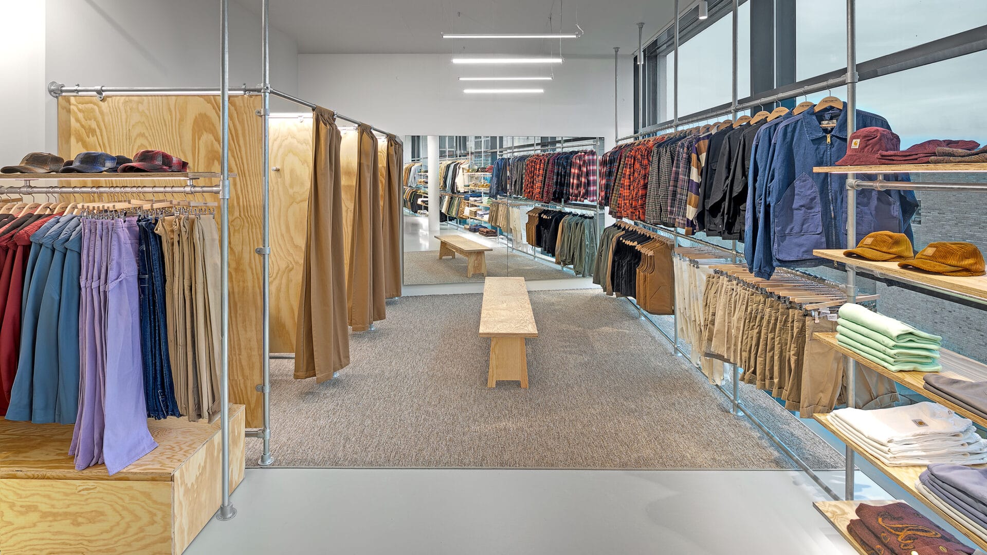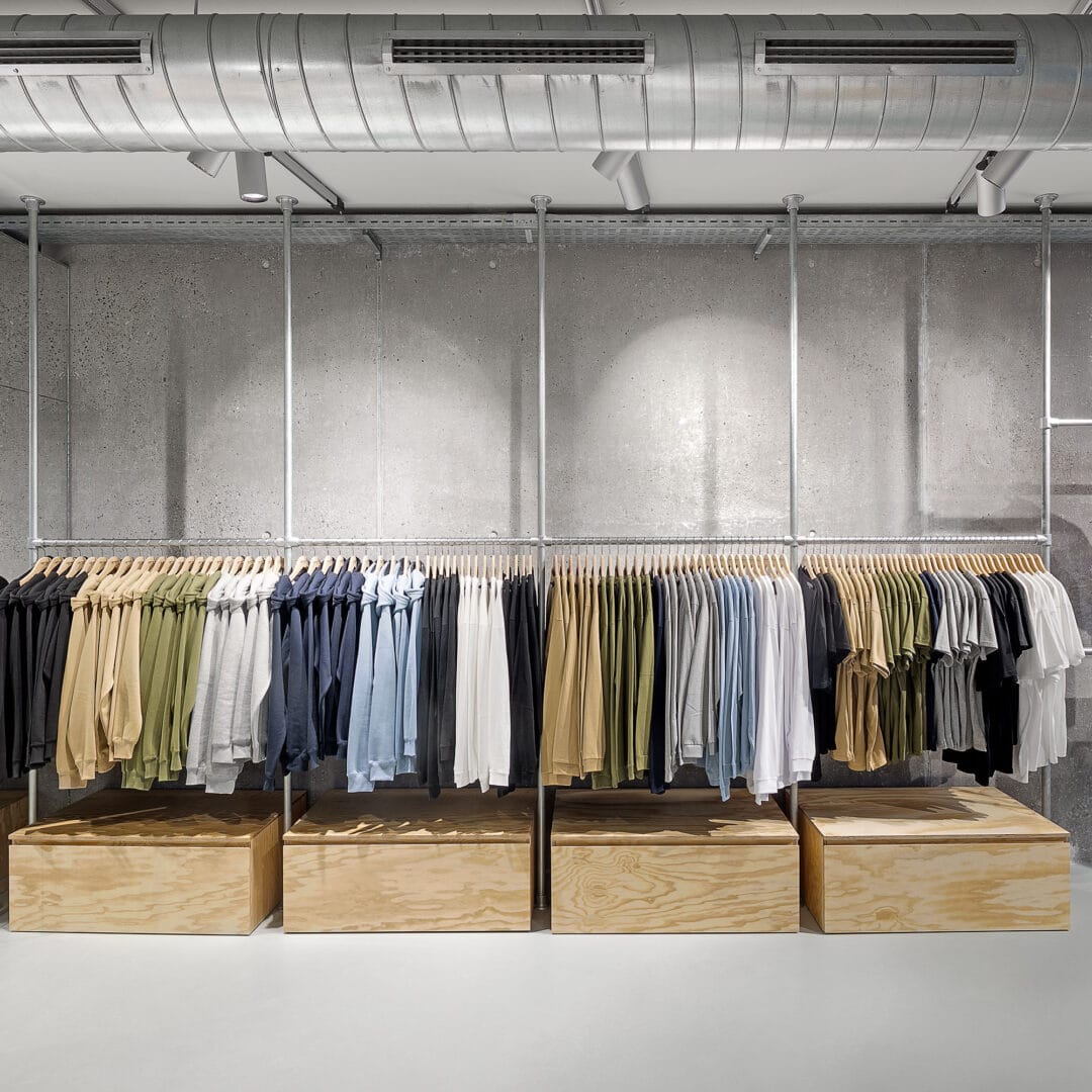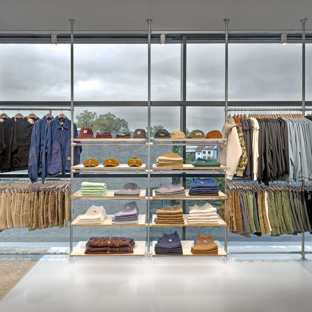 Die Wände sind keine Anspielung, sondern echtes Gerüst: ein Raster aus verzinkten Stahlrohren, robust, mit sichtbaren Gebrauchsspuren – genau der raue Charakter, der zu Carhartt passt. Dazwischen sitzen Seekiefer-Paneele und geben der Fläche Ruhe und Struktur. Integrierte LED-Bänder laufen entlang der Linien und bringen die Ware klar nach vorn, ohne zu blenden. Das Ergebnis wirkt funktional und aufgeräumt, mit einer klaren, industriellen Handschrift. Geliefert wurde das System von einem Anbieter, der normalerweise Gerüste für Baustellen baut – hier wird das Handwerk einfach ins Retail übersetzt.